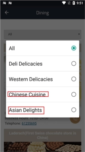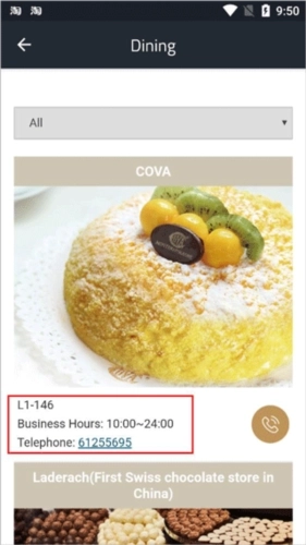 4、点击“Dining”选项,即可查看大厦内所有餐厅的相关信息,包括它们的营业时间、联系电话等内容。