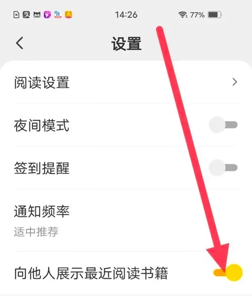 进入设置界面后,找到【向他人展示最近阅读书籍】这个选项,将对应的开关关闭就可以了。