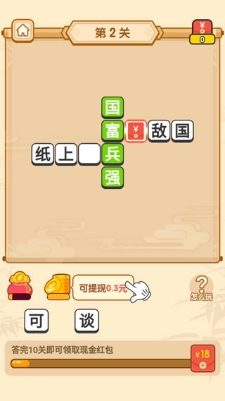 成语多多红包版是一款有趣的成语答题赚钱软件,此版本为红包版,用户登录即可领取大额红包,还能通过玩成语游戏获取红包,最后可进行提现。用户初始身份是乞丐,通过持续闯关提升自己,凭借成语答题一路升官发财,最终成为超级富有的一品大员。闯关的关卡越多,得到的金额就越多。