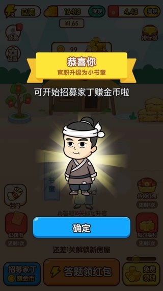 4、游戏里还融入了养成玩法,随着你持续答对成语,官职会得到提升,还能更换更大的房子。