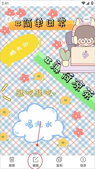 2、接着进入个人手账页面,点击“编辑”选项开启手账编辑操作,以此去掉模板自带的水印。