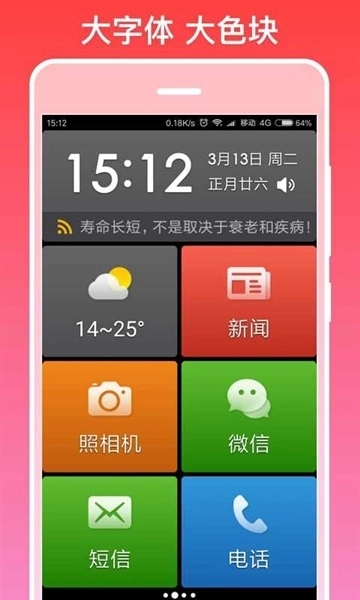 2、实用性突出:该软件在涵盖智能手机桌面基础功能的同时,结合老年人的使用特点,额外增添了语音播报、大字体显示等诸多实用功能。