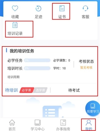 学员在“我的”页面【我的培训任务】可以看到当前需要完成的课程、考试等;