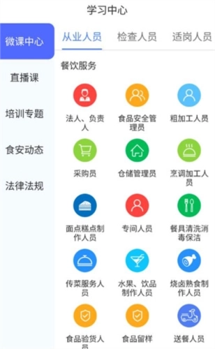进入课程模块后,根据培训人员相关属性,选择相关类别人员学习课程。如点击“从业人员”或“检查人员”,可看到餐饮行业从业人员和检查人员相关培训课程,点击相应课程,即可进入“课程列表”,点击课程列表中的课程,进入课程的学习。
