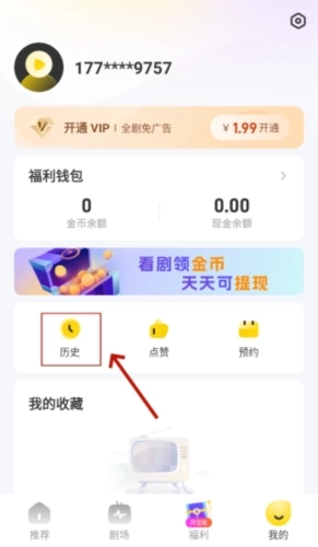 2、若要删除星芽短剧的历史记录,需先进行手机号登录操作,登录完成后,点击“历史”选项,即可进入“观看历史”界面。
