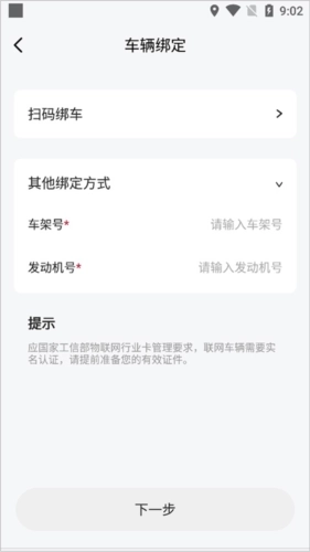3、若车辆中控大屏未显示绑定车辆的二维码,用户可点击上图页面里的【其他绑定方式】,在弹出的新页面中,通过输入车架号与发动机号完成车辆绑定。