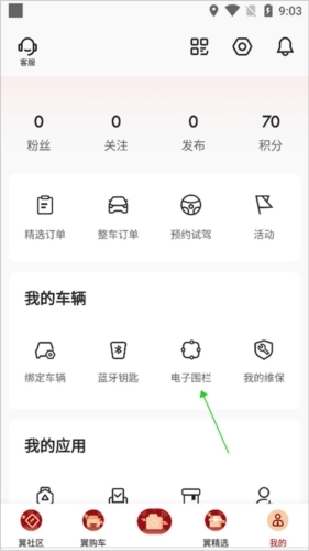 2、绑定成功后,进入【我的】页面,点击其中的【电子围栏】选项。