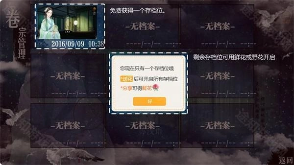 进入存档界面后,第一个存档位是免费提供的。其他存档位则需要通过鲜花或野花来解锁。分享作品能够获取野花,野花是专门赠予该作品的,并且可以替代部分鲜花使用。