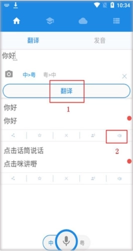 2、接着点击翻译结果下方显示的已翻译好的话筒图标,再点击喇叭图标就能播放语音了。