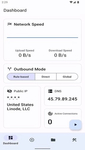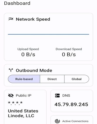 4、进入仪表盘界面,可以在此界面切换不同的代理模式,推荐使用默认的规则模式,即按配置文件规则自动分流网络数据。