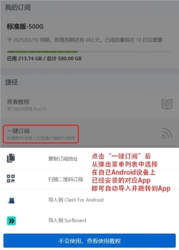 1、使用已经安装了客户端的安卓本设备浏览器登录进入个人中心,在仪表盘页面下方的捷径区域找到“一键订阅”按钮,点击并选择导入到选项。点击后会自动提示跳转到客户端。