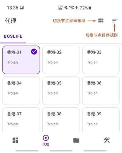 一般正常情况下会自动对某一个配置文件里的所有节点进行速度测试,选择出延时最低的节点连接,如果你想选择连接到特定节点,可以点击软件的代理按钮,跳转到代理页面,然后根据自己的需要选择特定节点进行连接。