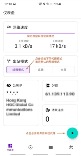 点击右下方的总开关即可开启系统代理。当成功启动后,本界面会出现相应的网络速度、流量及使用时间等实时信息。