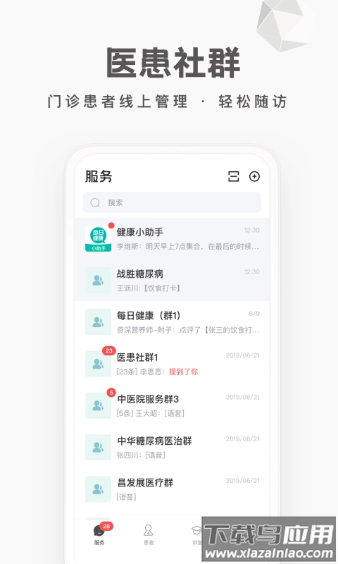搭建专属的患者交流群组,支持文字、语音、图片等多种沟通形式,医生能够批量推送注意事项。