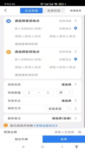 汽运货主软件设有货源发布入口,只需填写详细的货源信息,就能在线一键完成发布。