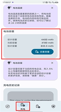 2、点击下方菜单栏里的“充电”按钮进入,在当前页面向下滑动找到电池容量,就能查看电池的出厂容量以及预估容量(电池寿命)了。