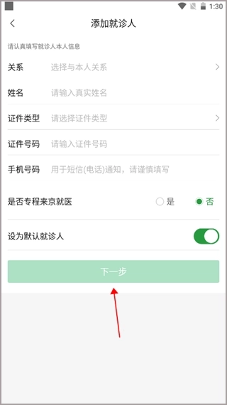 3、填写就诊人的个人信息,像姓名、身份证号等,点击下一步添加成功。