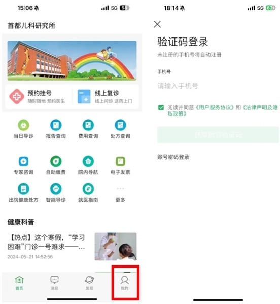 打开首都儿科研究所,首页点击“我的”进行注册/登录。
