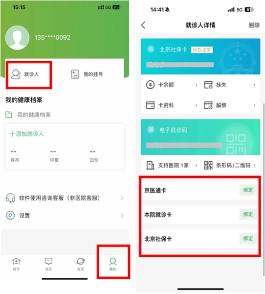 京医通卡、公众号电子就诊码、北京医保患儿在“我的”-“就诊人”中进行对应类型绑定。