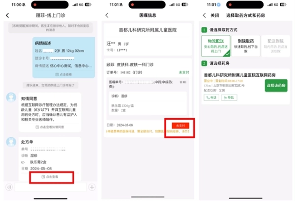 收到处方,核对药品并点击“去支付”,选择“物流配送”或“到院取药”,选择支付方式(北京医保患者选“北京医保”可进行线上医保实时报销)完成支付,邮费由快递公司收取。