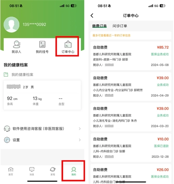 在“我的-订单中心”中查看订单详情,包含挂号、缴费、快递物流信息等。