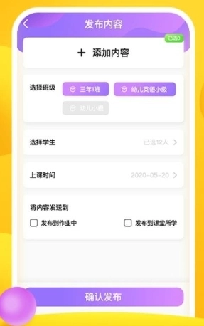 同时还需要用户将学生进行在线选择,完成学生选择后才能将作业发布给选择到的学生