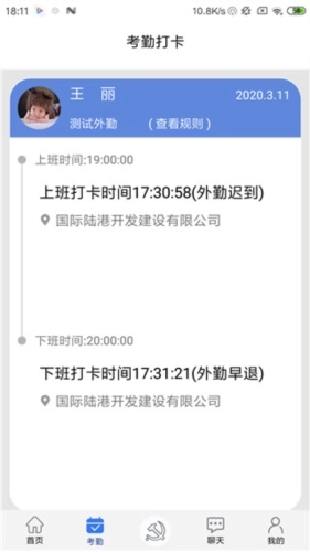 2、点击考勤,能够实时上班和下班打卡,简单方便