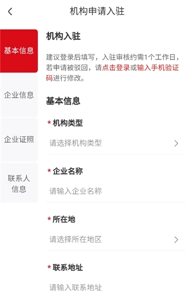 2、首先填写基本信息,详细输入机构的类型、企业名称、所在地、联系地址等。