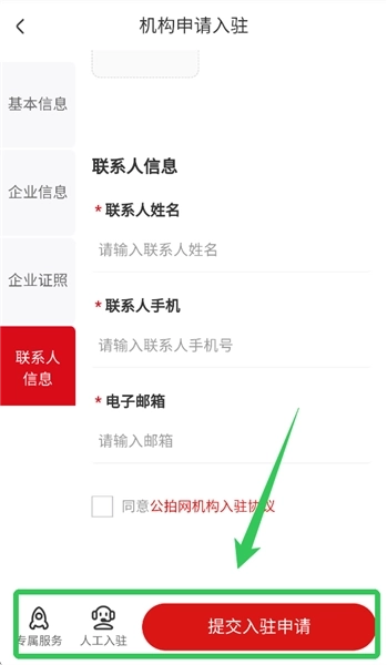 6、如果有什么疑问可以点击下方【人工入驻】找客服了解,全部填完并且没有问题的话点击下方的【提交入驻申请】就可以了,审核需要一个工作日。