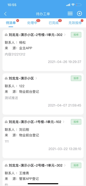 业主提交的维修、投诉等工单可实现自动分类,并支持派单、转接以及进度查询功能。