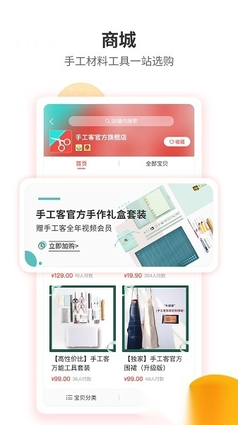 3、材料商店:涵盖布艺、皮艺、纸艺、编织、饰品、木艺、羊毛毡等全品类手工材料包、配件与工具,可一站式满足手工制作所需。