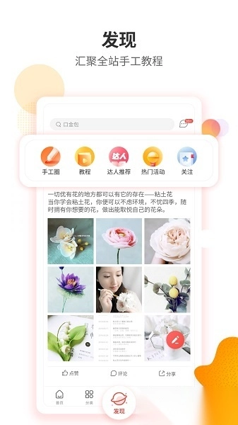 4、手工圈:平台内设有50多个专业手工圈子,你可以在这里和700多万手工爱好者一起交流学习、分享创作心得。
