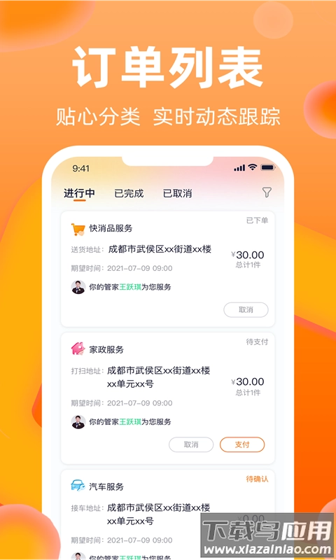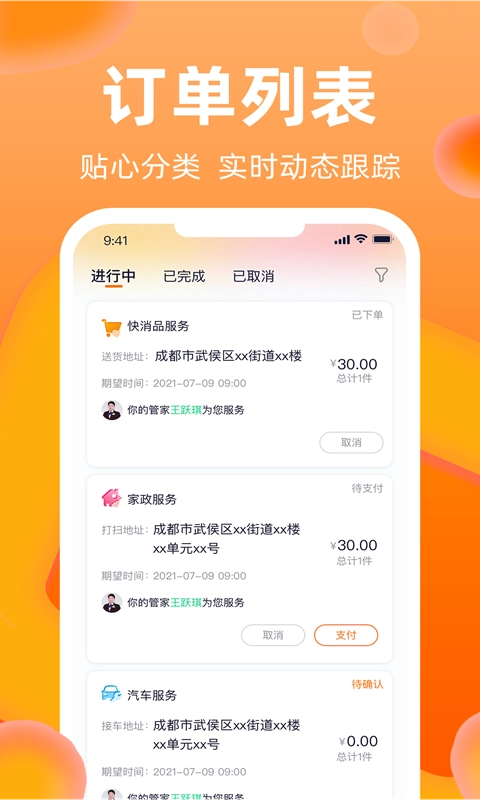 订单管理通过颜色标签来区分不同状态,待服务、进行中、已完成的订单会分栏呈现;客服系统全天候在线,遇到紧急问题时可直接拨打管家专线。
