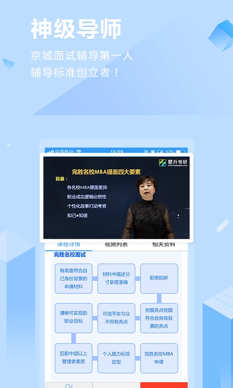慧升MBA是一款聚焦管理类联考备考的在线教育平台,旨在为用户打造高效便捷的学习体验。该平台汇聚了丰富的优质教学资源,覆盖英语、数学、逻辑、写作四大核心科目,借助系统化的分级课程助力考生逐步提升;专业教师团队在线实时答疑,配合真题解析与模拟训练,让备考过程更具针对性和效率。平台界面简洁直观,功能模块分类清晰,从基础夯实到冲刺提分构建了完整的学习闭环,尤其适合在职备考人群利用碎片化时间学习;目前注册即可免费体验部分课程,感兴趣的朋友不妨一试。