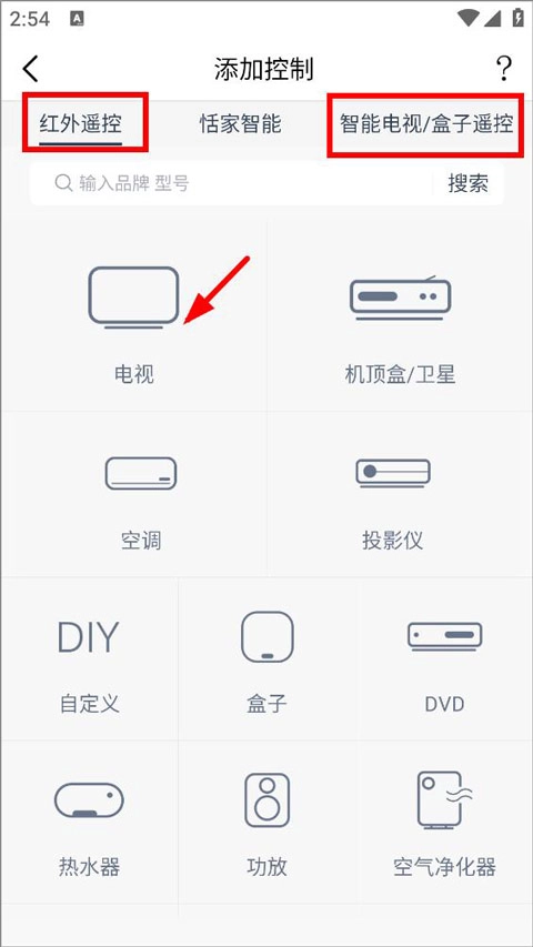2、进入添加控制页面后,用户可以在红外遥控和智能电视/盒子遥控这两个选项中进行选择。