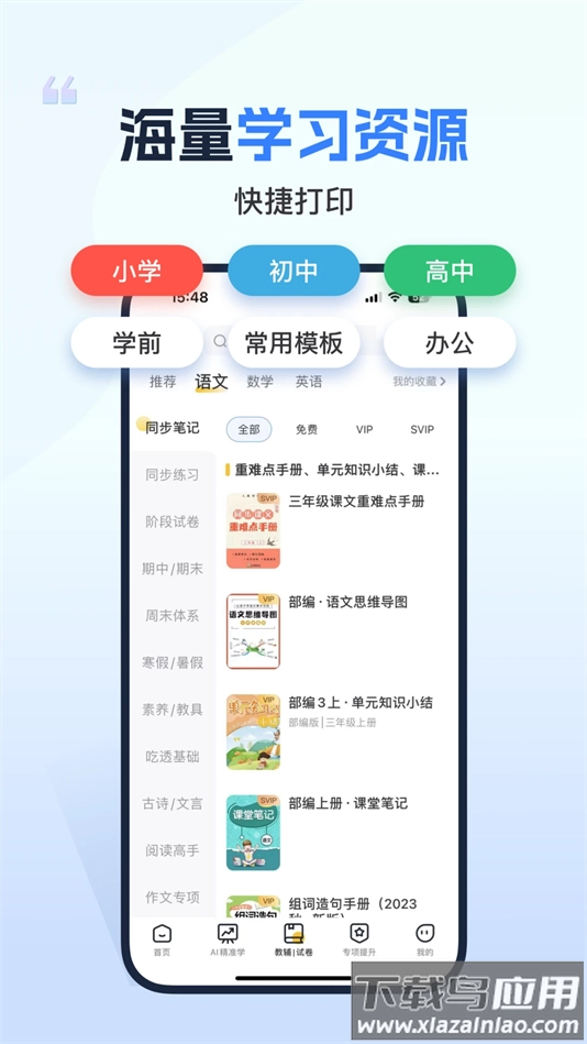 小白学习打印是一款面向学生和家长的手机打印应用,借助它能便捷连接家用打印机,达成随时随地的文档打印。软件丰富学习资源,涵盖最新教材同步内容、名师授课视频与各类练习题集;此外,还具备试卷翻新、错题归集等实用功能,让普通打印机轻松升级为智能学习帮手。用户也可通过微信小程序或电脑端进行同步操作,软件中精选了多种文档模板可供直接使用,操作界面简洁明了,仅需三步就能完成打印流程。若想感受智能打印的便利,不妨现在就体验一下。