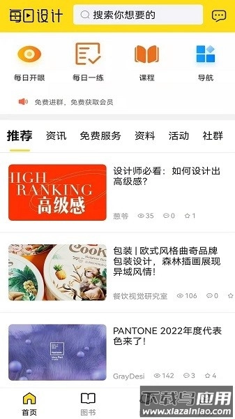 设计教程涵盖字体设计、摄影后期等类别,每个案例都配备对应的素材;设计资讯部分整合了CAD、PR等软件的使用技巧,零基础用户能够借此进行系统学习以入门;社区支持网页设计、3D建模等垂直领域的交流,并且和腾讯课堂等平台开展了内容合作。