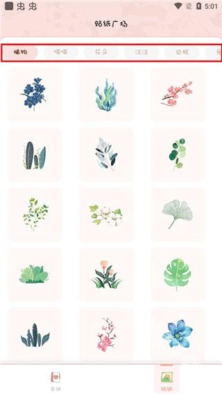 5、这里是贴纸广场,平台把贴纸做了细致分类,大家快来挑选心仪的贴纸制作手账吧!