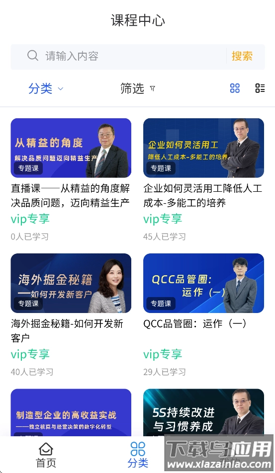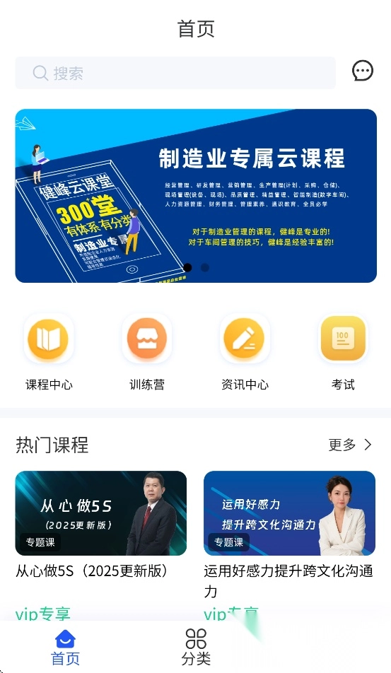 健峰云课程是健峰企管集团打造的在线学习平台,致力于为企业与个人用户提供专业培训服务。平台采用简洁直观的设计风格,涵盖课程中心、训练营、资讯中心、考试系统等核心功能模块,借助系统化学习路径助力用户提升职业技能。首页运用智能推荐算法推送个性化内容,分类板块支持按领域筛选课程,个人中心可查看学习进度与成果。平台整合了视频课程、在线测试、学习社区等多种资源形式,支持多终端同步学习数据,帮助用户高效利用碎片化时间。想要体验智能化学习服务的朋友可以直接使用最新版本。