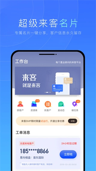 这款应用是专为置业顾问与房地产经纪人打造的,核心在于为经纪人配备各类客户跟进工具。借助它,经纪人既能发掘新客户,也能拓展客户资源、维系现有客户关系。乐居来客的超级来客名片等特色功能,能让经纪人的销售工作更高效。加上我们专业团队的支持,您可以更自信地服务客户、提升业务能力。要是您是一心想给客户提供最优服务的经纪人,不妨试试这款应用。