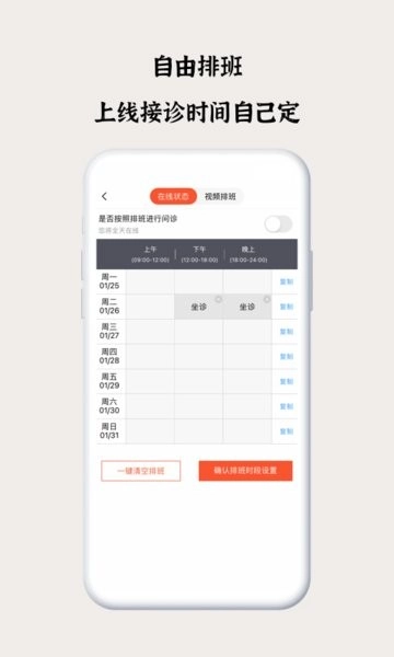 自定义工作时间表功能,支持分时段灵活编辑;实时显示医生在线状态,便于患者预约咨询;集成电子病历管理系统,历史问诊记录随时调取;提供标准化中药处方模板,智能生成煎服说明。