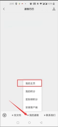 1、打开微信,进入“道客巴巴”公众号,点击下方菜单栏中的“我的道客”,再选择“我的主页”。