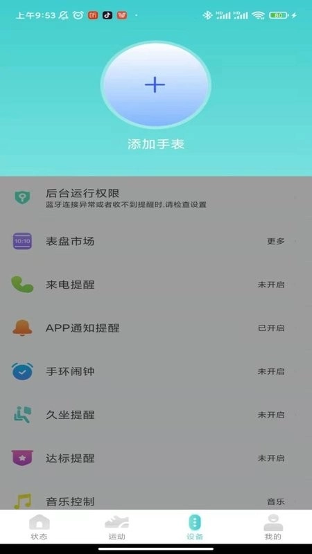 1、设备管理:支持连接多种型号的手环,能对闹钟、步数目标等进行个性化设置;