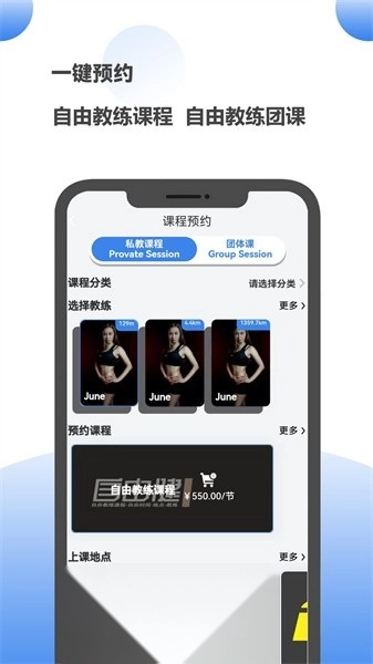 可以按课程类型和地理位置筛选周边场馆,还能查看教练的资质信息与用户评价;预约成功后系统会自动生成电子凭证,到店时扫码就能使用。