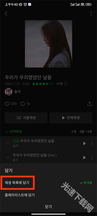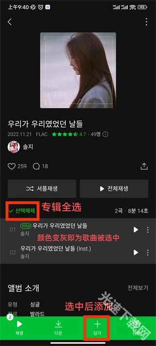 3、接着全选专辑,当颜色变为灰色时就表示歌曲已被选中,选中后点击添加按钮。