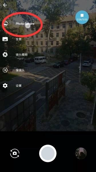 在手机上打开最新版的谷歌相机后,向左滑动界面就能找到【Photo Sphere】这个功能选项。