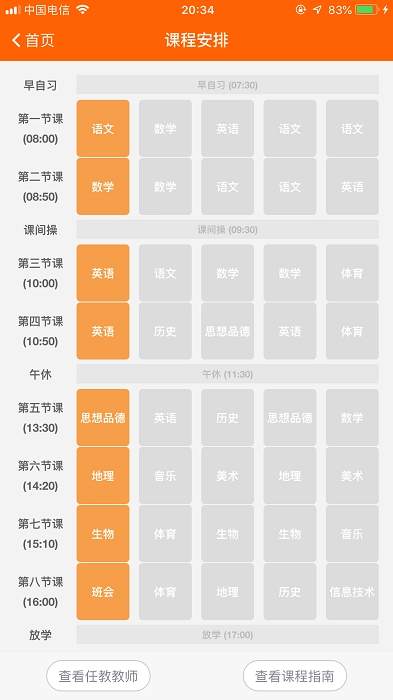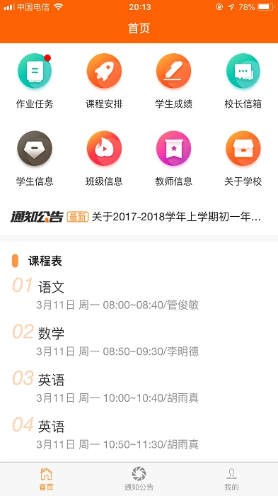 课程表查询能帮助家长提前为课后辅导内容做准备;校长信箱支持直接反馈教学方面的建议;作业管理模块会详细罗列出各科作业的具体要求;班级通讯录收录了全体学生的基础信息;成绩分析图表可直观呈现学习的进步曲线;座位表功能便于家长知晓孩子在教室中的具体座位位置。