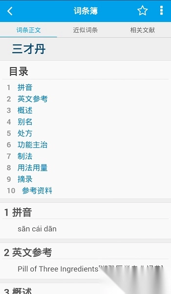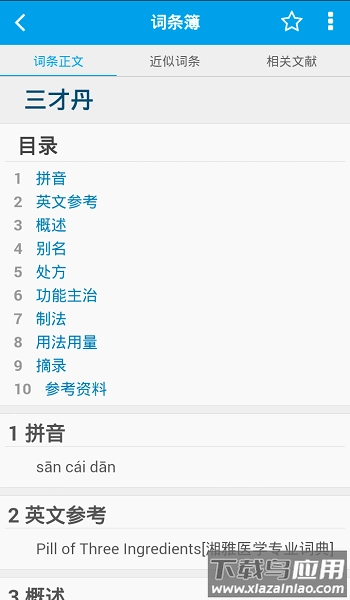 4.拥有相关词条推荐功能,涵盖相关穴位、方剂、药材、中成药以及多类别关联内容。