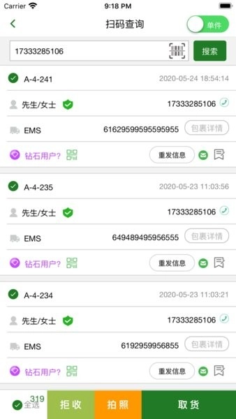 快速入库:同步扫描单号与手机号,一次操作即可完成登记;