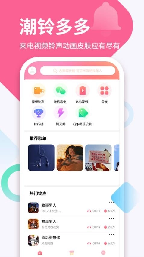 1. 潮铃多多作为一款手机铃声应用,拥有海量且多元的铃声资源库,用户能依据个人偏好随心挑选。不管你钟情于哪种风格的铃声,都能在这款软件里找到心仪之选。